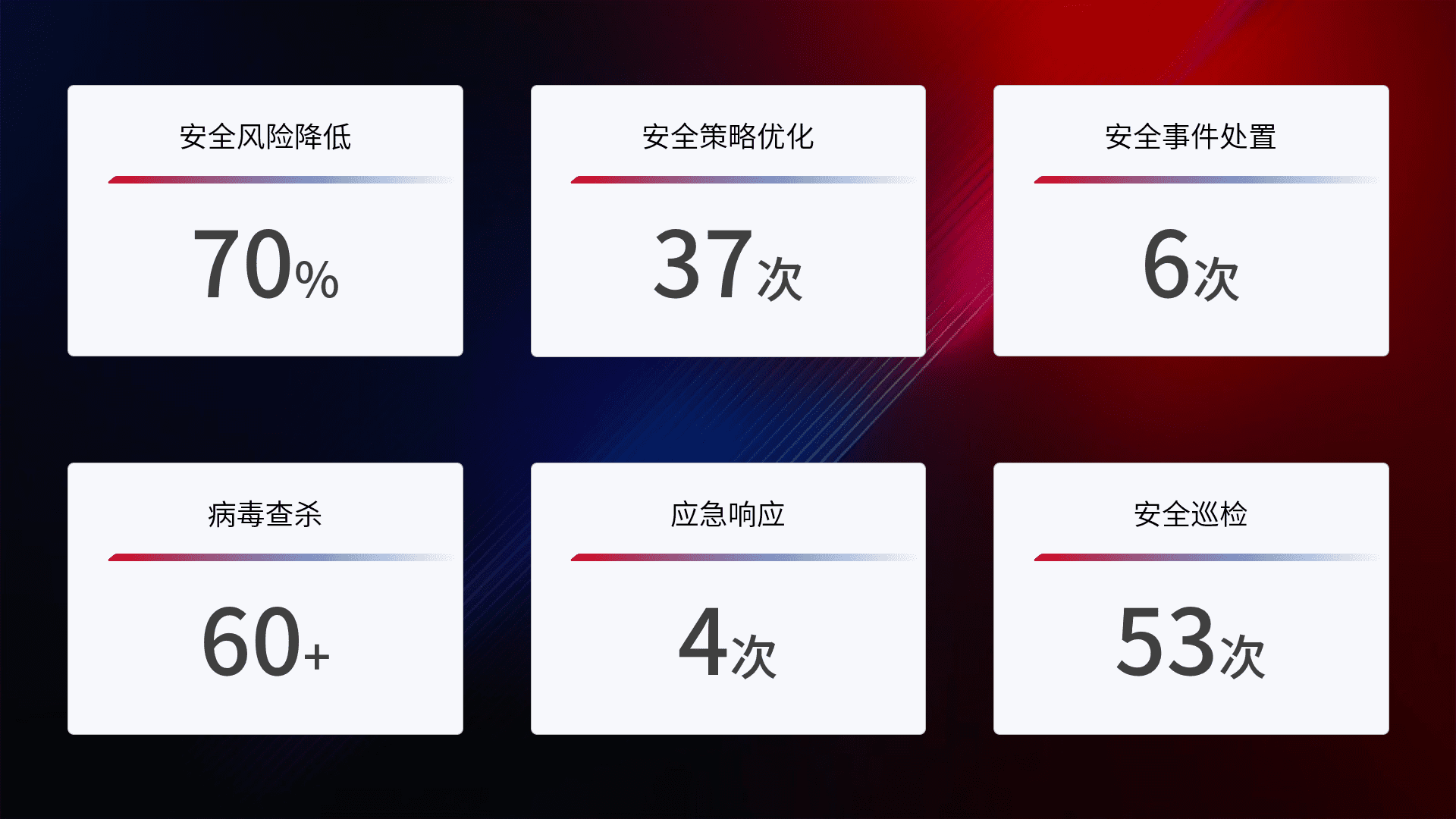 提供全面的安全事件报告体系,,包括处置报告、、、、周报、、、季度和年度总结,,,结合持续监控,,,帮助客户深入了解网络安全状况。。。。