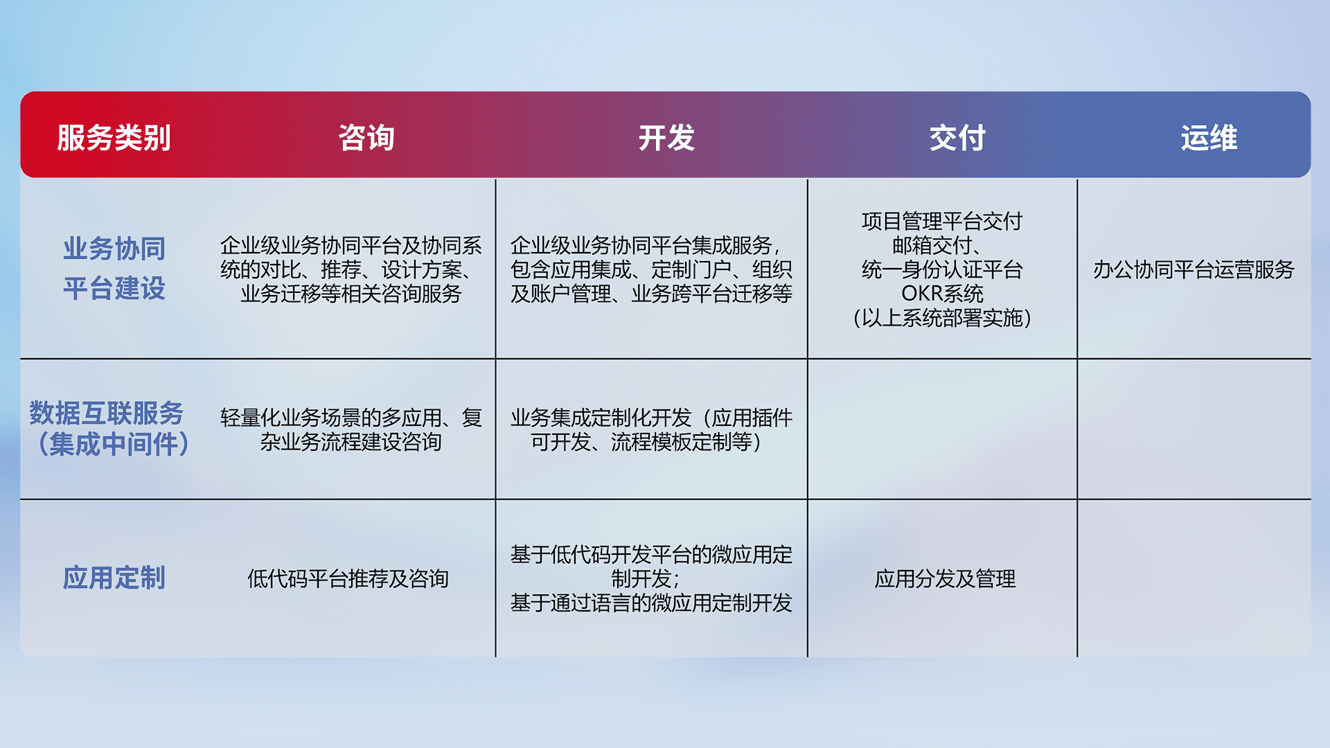 针对钉钉、、、、企微、、、、IDaas等平台级产品提供产品的规划、、、、方案、、交付、、定制化开发等服务,,,实现如统一协同办公、、智能客户服务、、、混合会议管理、、、、智能数据查询、、、等业务场景,,,,实现数字化转型。。。